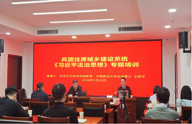 为持续深化学习贯彻习近平法治思想,切实提升全系统干部职工法治素养与依法履职水平,把法治理念贯穿住房城乡建设工作全过程各环节中。2026年1月22日,兵团住房城乡建设系统组织开展《习近平法治思想》专题培训,兵团及各师住建局分管法治工作领导、业务骨干及一线执法人员共400余人参加视频培训,以集中学习赋能法治住建建设,为兵团住建事业高质量发展筑牢法治根基。